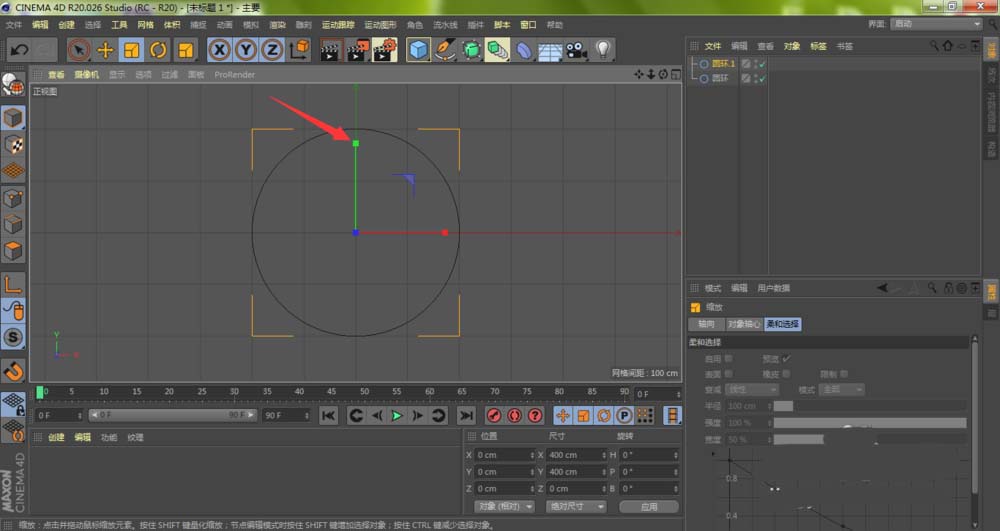 接下来,需要对第二个圆环(圆环1)进行缩放。按下键盘上的快捷键T,切换到缩放工具,当然,直接点击工具栏上的缩放图标也是一样的。选中“圆环1”,拖动进行缩放,让它比第一个“圆环”小一圈。这个小的圆环,将决定铁环截面的粗细。