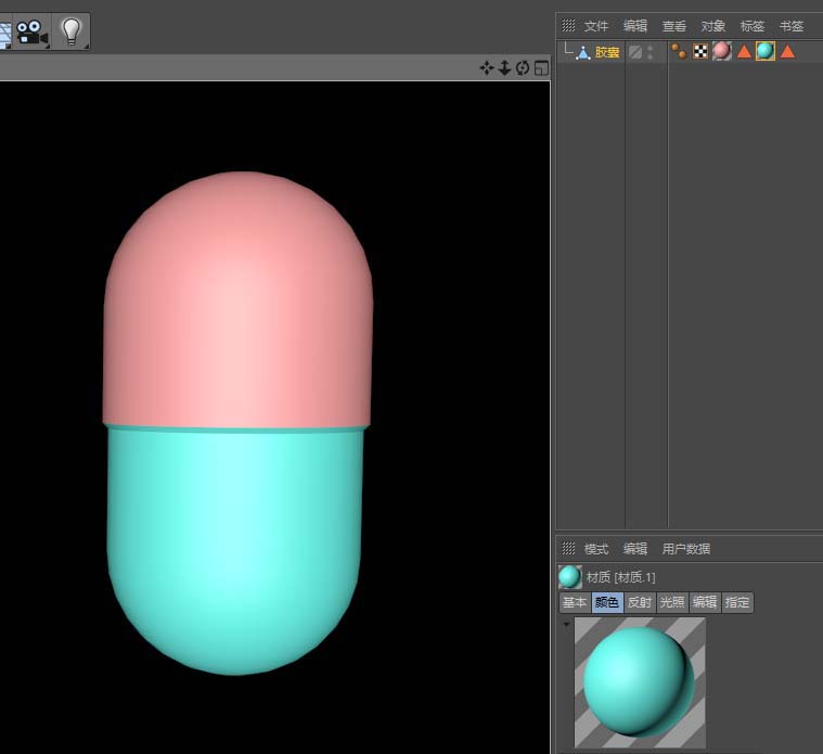 模型形态塑造好之后,就该上“妆”了。在材质管理器里,新建两个材质球。这通常是制作双色胶囊或赋予不同质感的第一步。