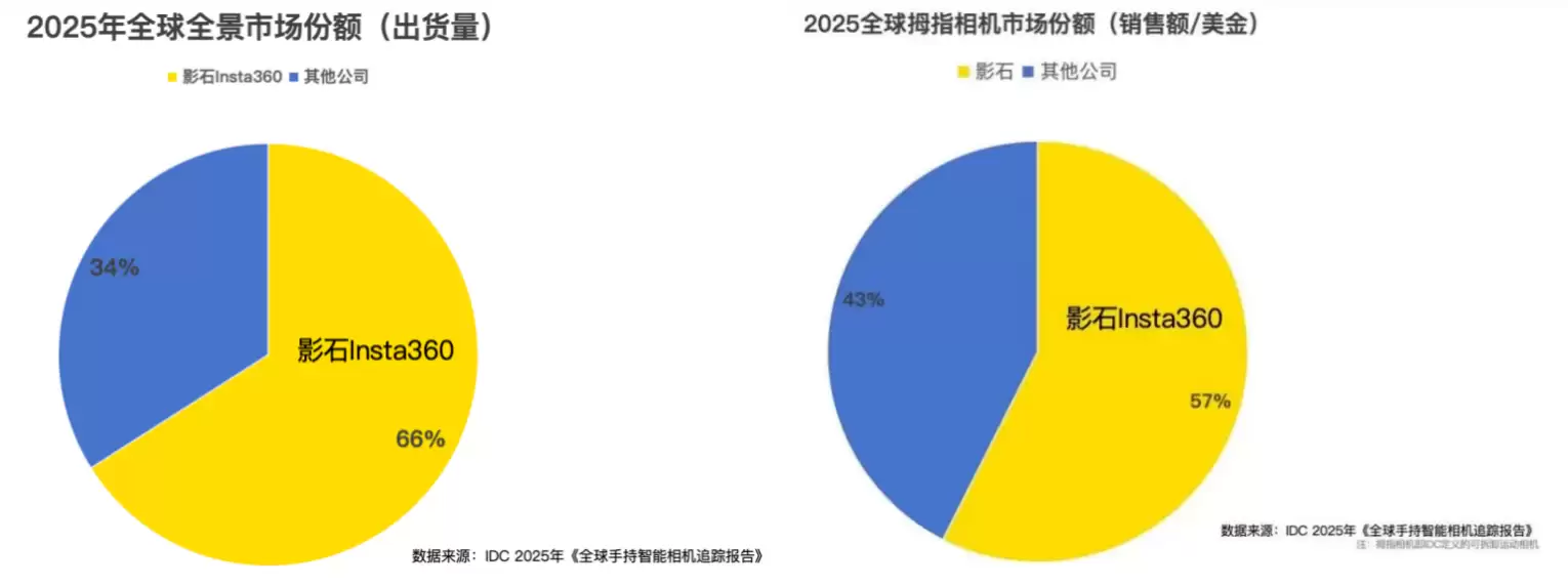 市场数据也支撑了这一判断。根据IDC最新报告,影石在其核心原创的全景相机与拇指相机品类中,全球市场份额分别达到66%与57%,领先地位稳固。