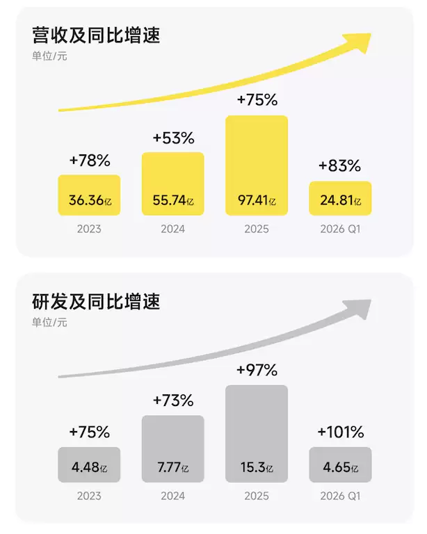 那么,投入的力度究竟有多大?2025年,影石研发投入高达15.3亿元,同比增长近100%,规模甚至超过了此前三年的总和。2026年一季度,研发投入继续攀升至4.65亿元,同比上涨101%。值得注意的是,研发投入的增速已明显超过营收增速,这清晰地体现了公司在关键技术与新品类上进行前置布局的决心。