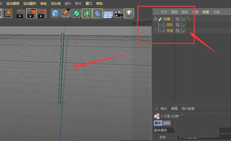紧接着,创建一个圆形样条,也就是圆环。把这个圆环和刚才画好的直线路径一同放入扫描生成器下。你猜怎么着?一条平面的样条线,瞬间就变成了一个有体积的圆柱体杆子。