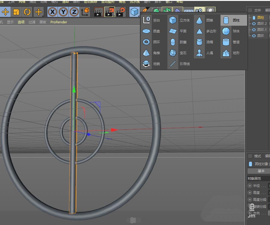 骨架有了,还需要辐条来连接。新建一个圆柱体,调整其半径和高度,让它成为连接轮辋的辐条,并摆放到合适的位置。
