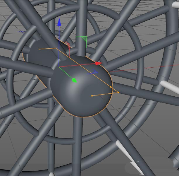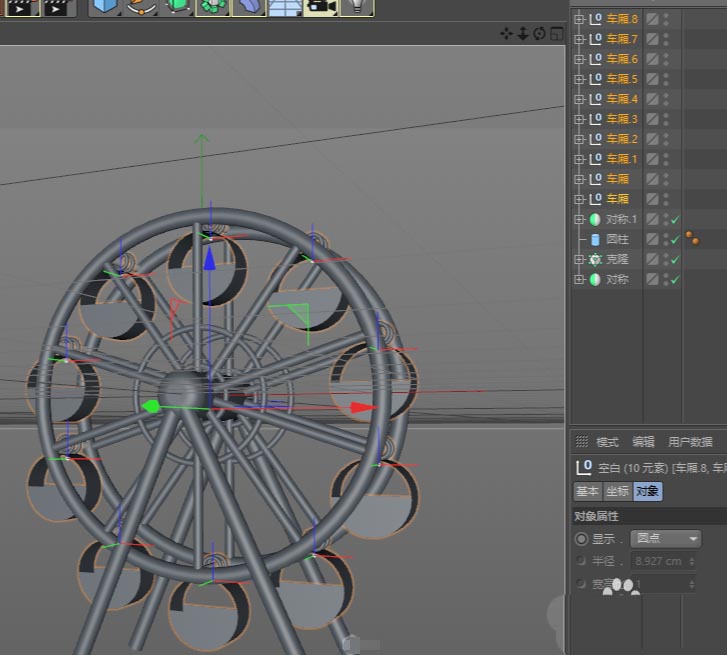 最后,利用克隆或者手动复制,将车厢和吊环依次摆放到轮子四周的每一个连接点上。