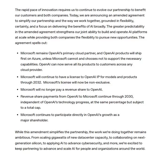 公告开篇就定下了调子:面对“日新月异”的技术创新,双方决定“优化合作模式”,核心原则是“灵活性、稳定性、普惠人工智能”。说白了,就是要简化机制,让协作更顺畅。