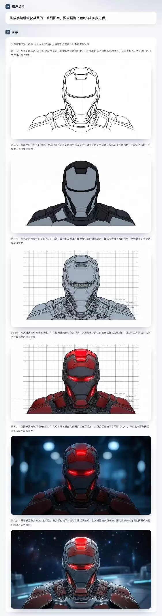再比如,让它从一张钢铁侠的草稿出发进行绘制:它能逐步进行连续创作,最终输出完成度很高的图像。每一步创作都精准地保持了前一步的结构与细节——这其中,统一表征所共享的上下文发挥了关键作用。