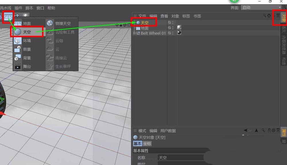材质准备好了,就需要一个承载它的“容器”。点击软件右侧的“对象”管理器,回到主视图。现在,我们需要在场景中创建一个天空对象。操作路径很直观:展开“地面”图标的下拉菜单,选择“天空”。当然,你也可以通过顶部菜单栏的“创建”→“场景”→“天空”来完成这一步。