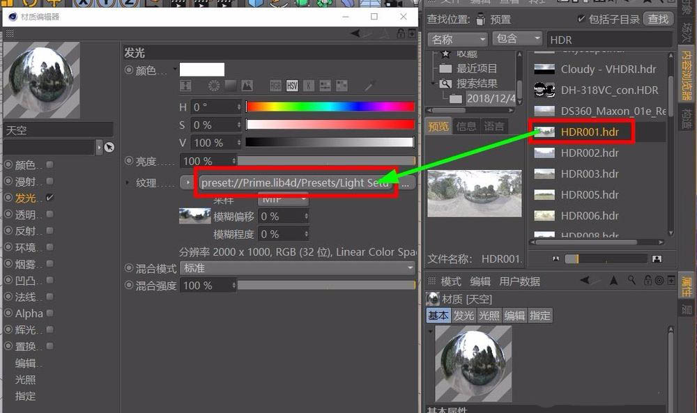 最关键的一步来了:用鼠标左键按住“HDR001”这个文件,直接把它拖拽到刚才打开的材质编辑器中,精准地放到“发光”通道的“纹理”栏里。看,简单直接,HDR贴图就这样被成功加载到材质球上了。