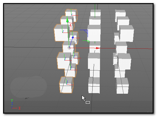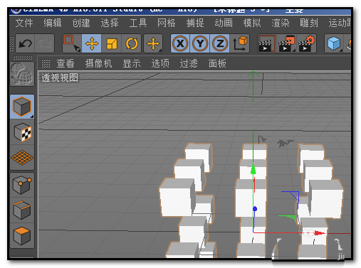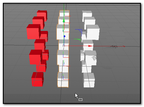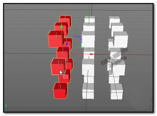 用框选工具,在视图窗口中把左边那一整排立方体都框选进来。最后,直接把刚才调好的红色材质球,拖拽到选中的这排立方体上。看,颜色一下子就附加上去了。