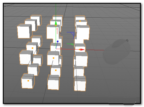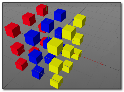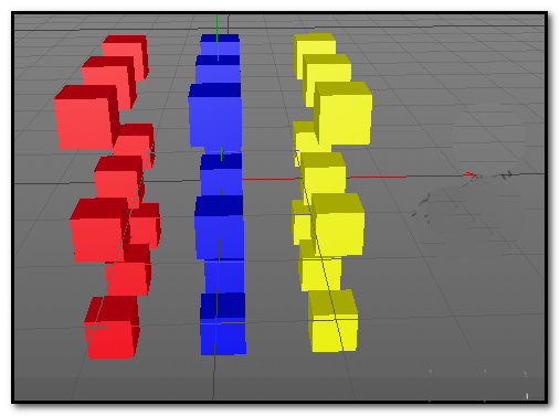 至于右边那一排,相信你已经完全掌握诀窍了。重复上面的步骤:创建黄色材质球,框选右侧目标,拖拽应用材质。完成后,一个拥有红、蓝、黄三色分明阵列的立方体矩阵就呈现在眼前了。
