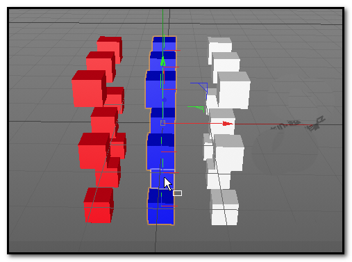 接下来如法炮制。在材质面板再双击创建一个新材质球,这次把颜色定义为蓝色。同样使用数字0键切换到框选工具,在视图里精准框选中间那一排立方体。然后把蓝色材质球拖拽过去,中排立方体瞬间焕然一新。