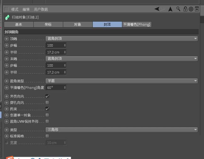 想让字体的起点和终点过渡得圆滑自然?调整扫描对象的“封顶”属性就行。勾选“约束”,选择“圆角封顶”,然后适当调整半径和步幅,那种生硬的断面感就消失了。