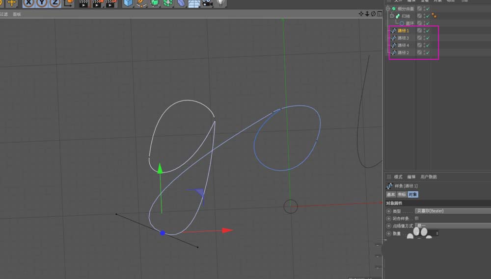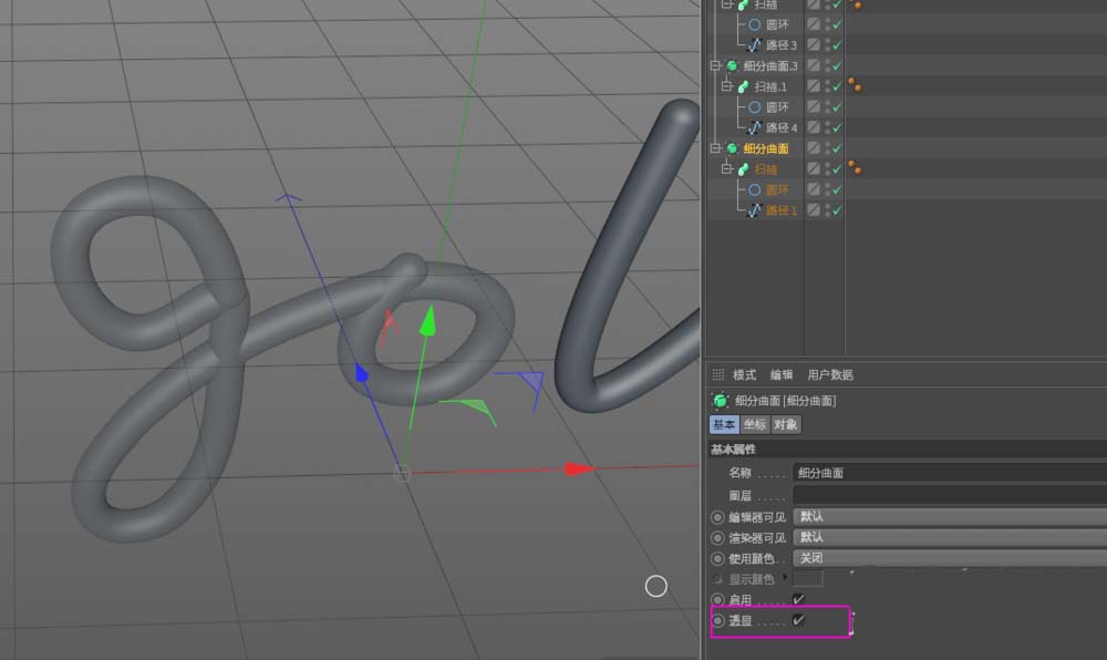 遇到连笔字或者路径交叉复杂的情况,细节调整就需要一点技巧了。选中细分曲面,在基本属性中勾选“透显”。这样一来,你就能透过模型看到内部的样条结构,方便后续操作。