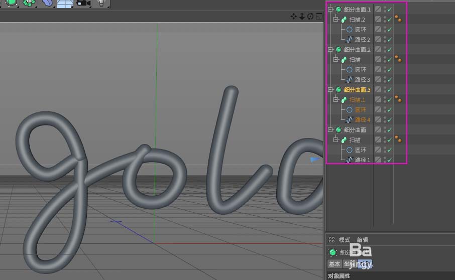 对象建好不代表万事大吉,它们的层级关系才是驱动造型的关键。重新排列一下,让“圆环”和你的文字样条,都成为“扫描”的子级,然后再把“扫描”拖到“细分曲面”之下。这个顺序对了,立体感的雏形立刻就出来了。