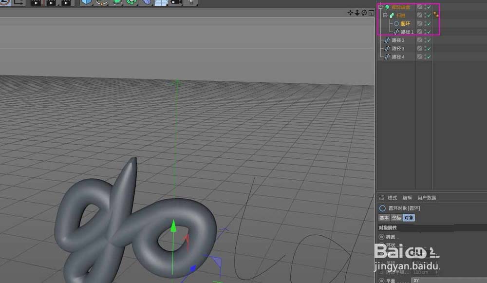 立体结构的成型,依赖于几个核心对象的配合。新建“细分曲面”、“扫描”和“圆环”三个对象,准备开始“组装”。