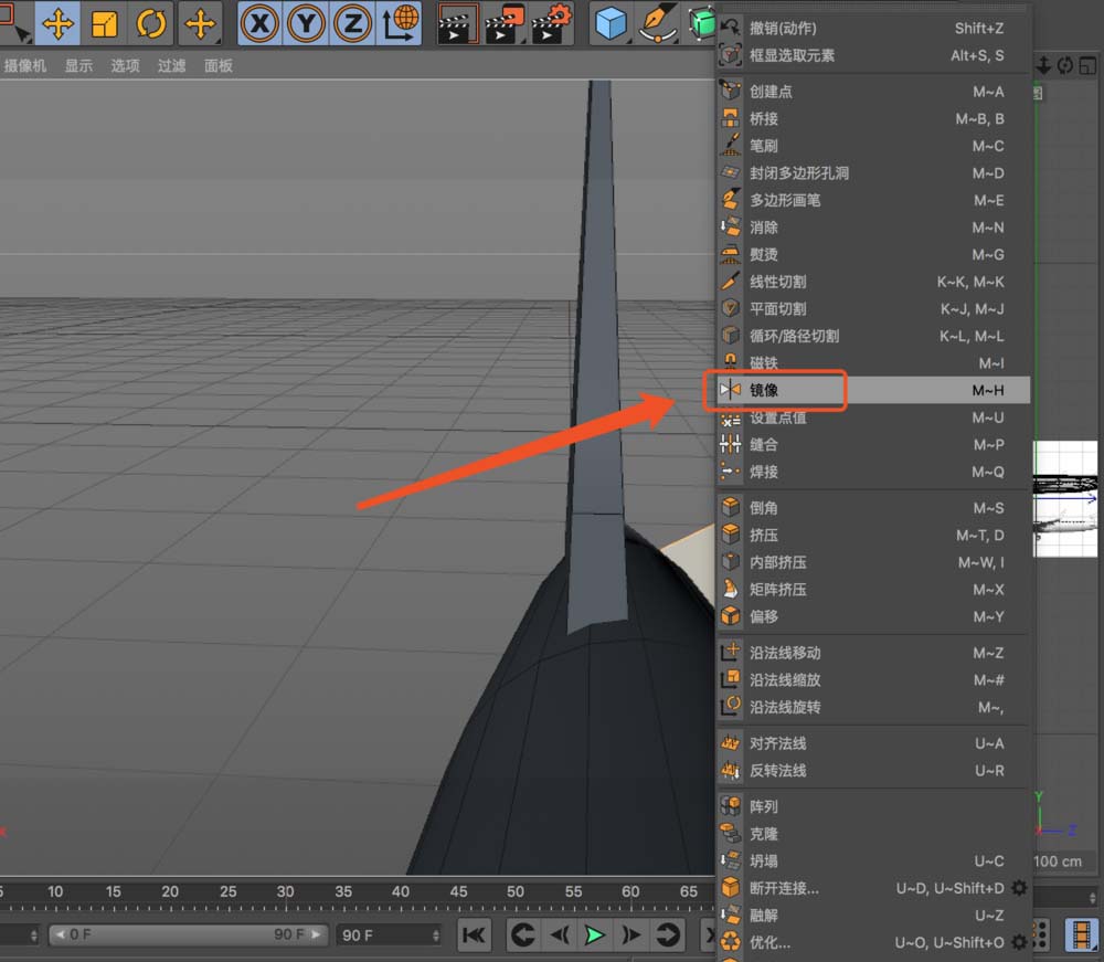 选中所有面之后,在视图区任意位置右击鼠标。这时会弹出一个功能菜单,在其中找到并点击【镜像】选项。这个命令就藏在这里。