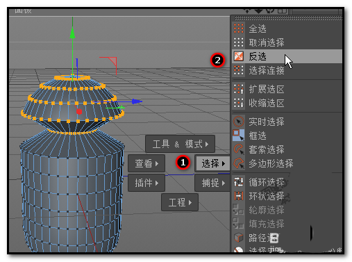 接下来这个小技巧很实用。保持点层级,按下V键,会弹出一个工具菜单,选择“选择”里的“反选”。这样一来,刚才选中的顶部顶点会被取消,而下面那一段的所有顶点则会被自动选中。这正是我们想要的效果。