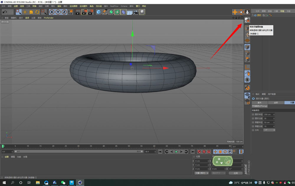 模型参数调好了,接下来就得让它进入可编辑状态。在对象面板中选中这个圆环图层,然后点击左上角的“转换为可编辑对象”按钮(或者直接按键盘上的C键)。这样,我们才能对它的点、线、面进行深入编辑。