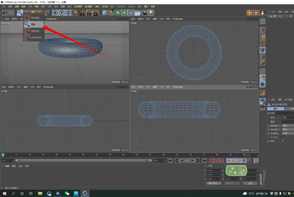 现在,是执行裁剪的核心步骤。确保你处于“点”模式下(顶部菜单栏有对应的图标)。然后,用框选工具在正视图里,框住圆环你不需要的那一半(例如,左半边或上半边)。选中后,直接按下键盘上的Delete键将其删除。