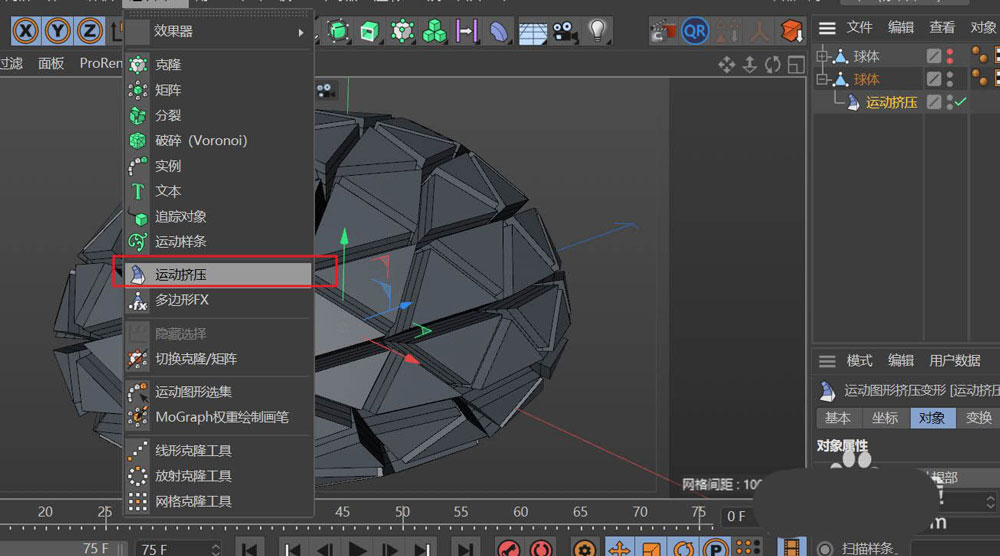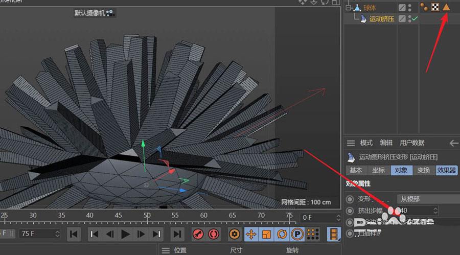 保存好选集,就可以进行核心的生长操作了。为这个模型添加一个“运动挤压”生成器,记得要让它作为模型的子级,这样才能正确起作用。