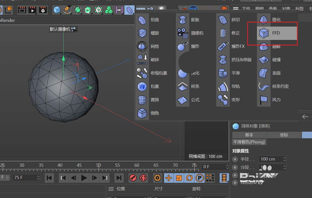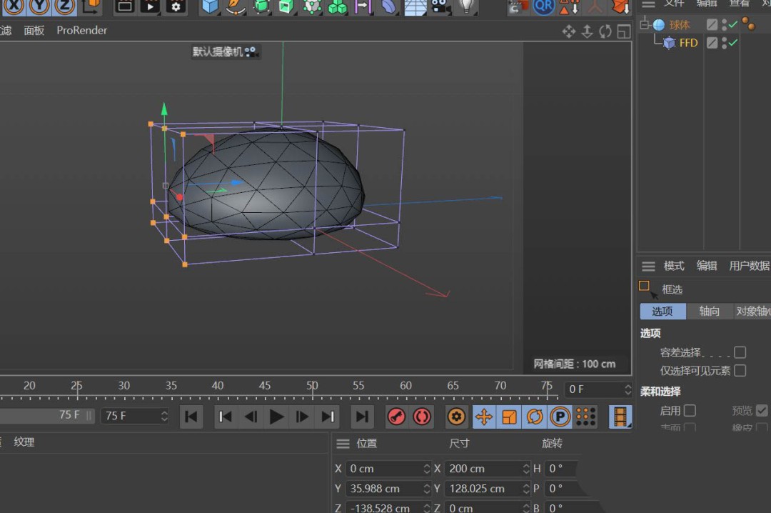 接下来,将这个二十面体球体转为可编辑对象。然后,请给它添加一个FFD变形器。这个工具就像一双无形的手,能让你自由地拉扯模型的外形。我们的目标是利用FFD的控制点,将圆球大致塑造成一个海胆的身体轮廓,也就是那种中间鼓、两头稍扁的形态。操作时多观察侧视图和透视图,慢慢调整,下图就是一个调整过程中的参考。