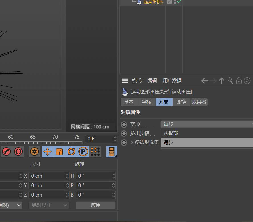现在,打开运动挤压的属性面板。在“对象”属性栏下,你会找到一个“多边形选集”的输入框。直接把上一步保存的面选集拖进去。接着,把下方的“挤压模式”从默认的“线性”改为“每步”。这个改动很重要,它意味着挤压的每一层都会进行独立的变换计算,为后续制造千变万化的尖刺造型创造了可能。