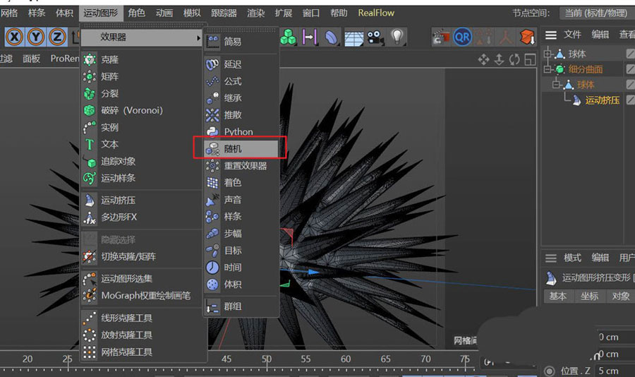 做到这里,刺是有了,但整齐划一,缺乏海胆那种张牙舞爪的自然感。这时候,效果器就该登场了。给运动挤压添加一个“随机”效果器。在它的“参数”面板中,将“旋转”的R值(即绕径向旋转)设置为1(或者根据你的场景大小灵活调整)。这样一来,每一根刺的生长方向都会产生随机的角度偏移,瞬间就有了生动、错落的感觉。