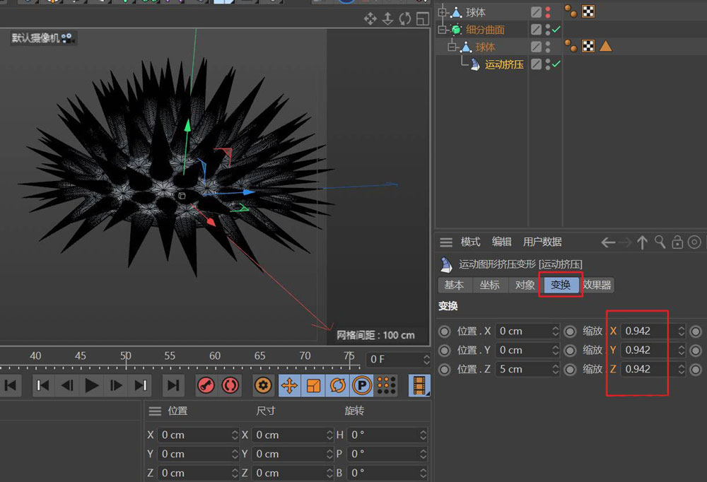 为了让基础形体更光滑,可以先为整个对象添加一个“细分曲面”生成器。不过,真正的变化发生在运动挤压的设置里。重点调整两个参数:一是“挤出步幅”,增加它能让刺变得更长;二是“变换”栏里的“缩放”值,随着挤压步幅的增加,逐渐减小缩放值(比如从1到0),这样挤出的造型就会从粗到细,变得细长而尖锐。多尝试几组数值,直到刺的形态你觉得合适为止。