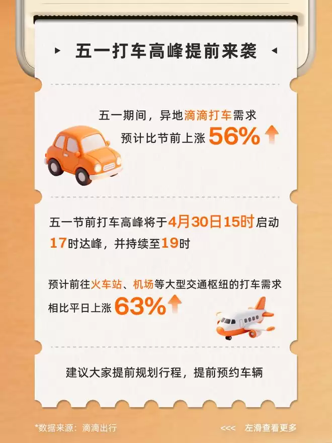 您的位置:首页 >滴滴发布五一出行预测,异地滴滴打车需求预计比节前上涨56%