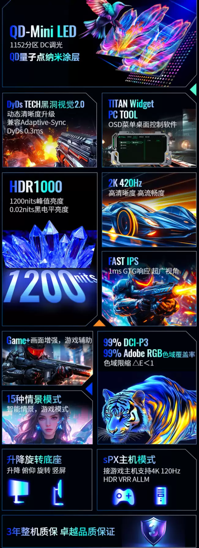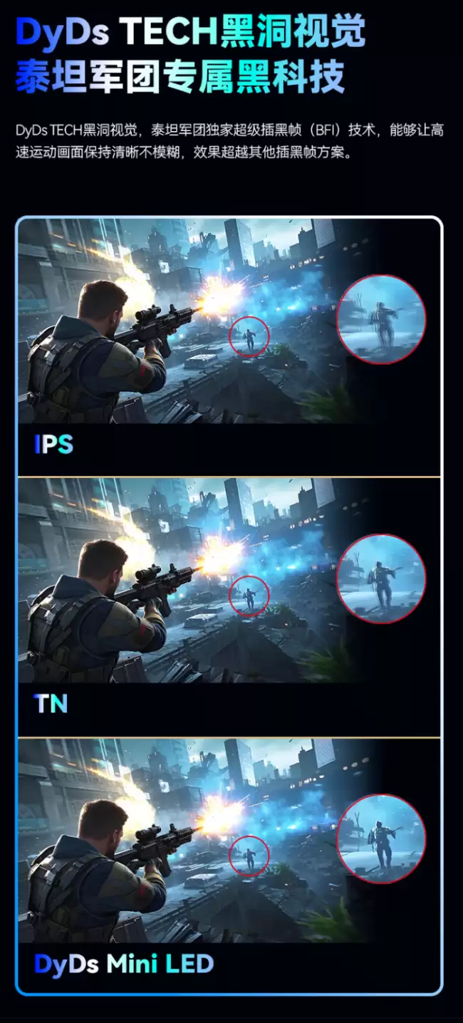 说到核心体验,就不得不提其搭载的DyDs TECH黑洞视觉独家技术。这项技术旨在解决高速运动场景下的画面拖影难题,能让疾速移动的游戏画面保持清晰、稳定不模糊。更关键的是,它能大幅降低甚至消除背光与画面之间的延迟,实现所谓的“闪光早醒”效果,这对于分秒必争的竞技游戏而言,意味着更跟手的视觉反馈。
