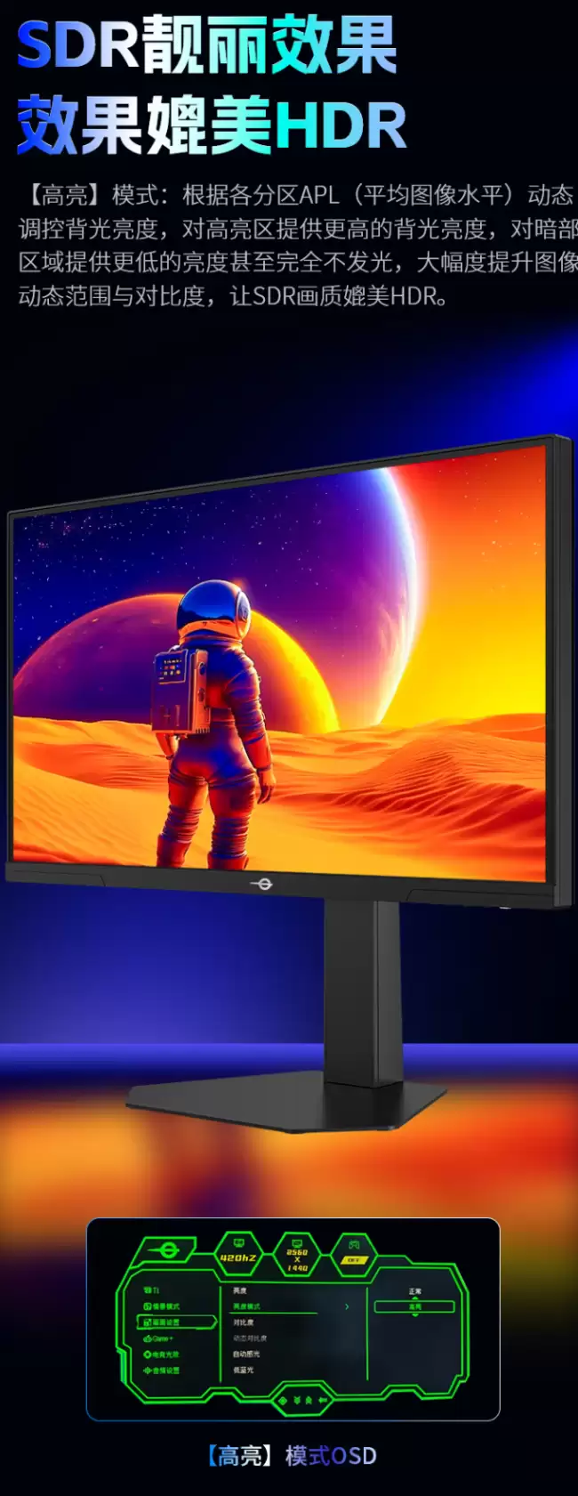 规格层面,这款显示器可谓堆料十足。它采用了QD-Mini LED背光技术,并升级到了1152个局部控光分区。这意味着背光系统可以根据屏幕显示内容的需要,进行精细的亮度调节,该亮的地方亮,该暗的地方暗。其表现符合HDR 1000标准,峰值亮度达到1200nits,动态对比度更是高达250万:1,能够呈现更丰富的明暗细节。刷新率方面,原生支持360Hz,并可超频至420Hz,配合1ms的GTG灰阶响应时间,为极致流畅的电竞体验打下了硬件基础。