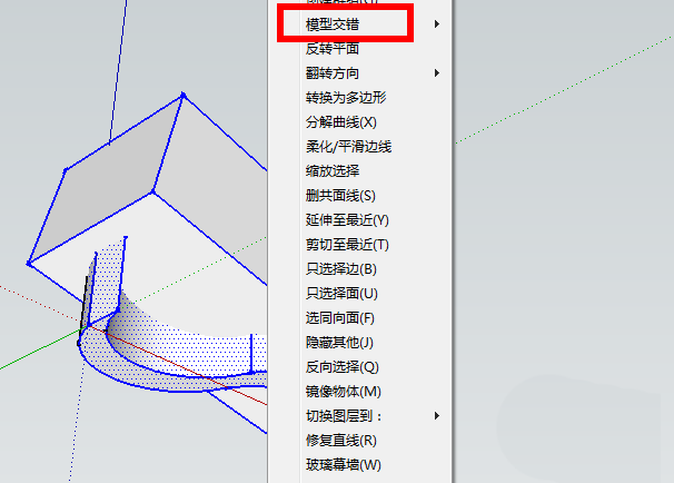 6. 好戏来了。同时选中这两个相交的模型,单击鼠标右键,在菜单中找到“模型交错”并执行。这个命令就像一场精确的手术,瞬间就会在两个模型的交集处生成清晰的边线。这些新生成的线条,就是未来坡道斜面的准确边界。