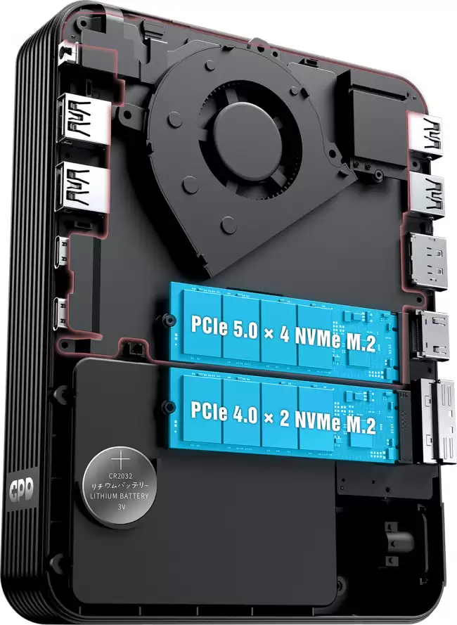 存储方面,两个版本的GPD BOX都配备了32GB或64GB的LPDDR5x 8533 MT/s内存,并提供了2个M.2插槽。