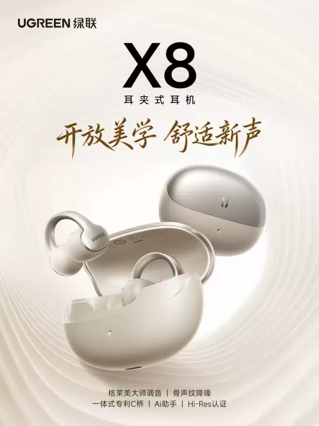 关注开放式耳机的用户,今天可以留意一下新品。绿联 X8 耳夹式耳机已在京东平台正式开售,首发价格为399元。