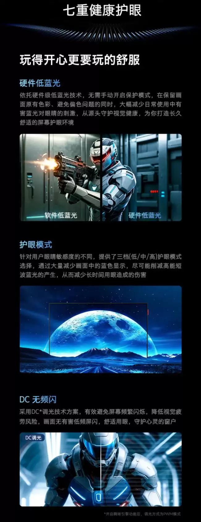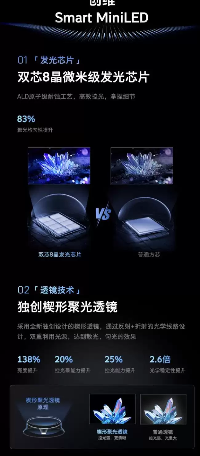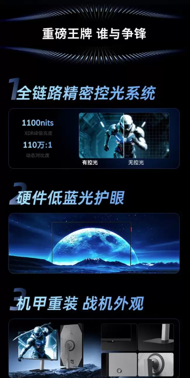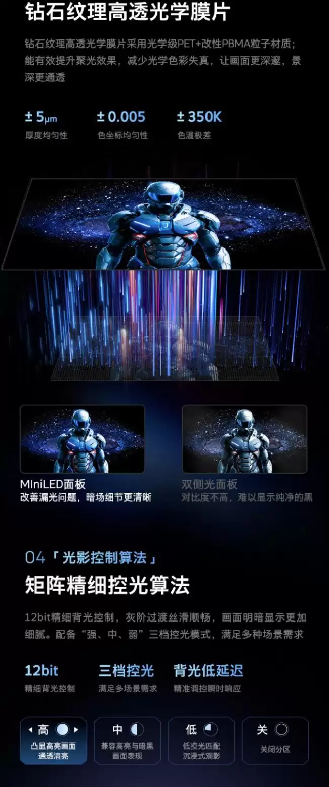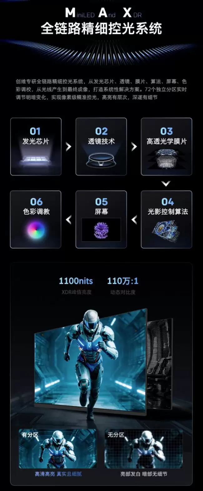 这款显示器的画质表现,很大程度上要归功于其“全链路精细控光”系统。简单来说,就是通过背光分区的精准控制,来实现更纯净的暗场和更耀眼的高光。它配备了72个独立控光分区,能够实时调节画面的明暗变化。其XDR峰值亮度可以达到1100nits,动态对比度更是达到了110万:1的高水准。在背光结构上,它采用了双芯8晶的微米级发光芯片,官方数据显示其聚光均匀性提升了83%。再加上独创的楔形透镜设计,能够对光源进行双重利用,理论上可以有效改善光晕现象。