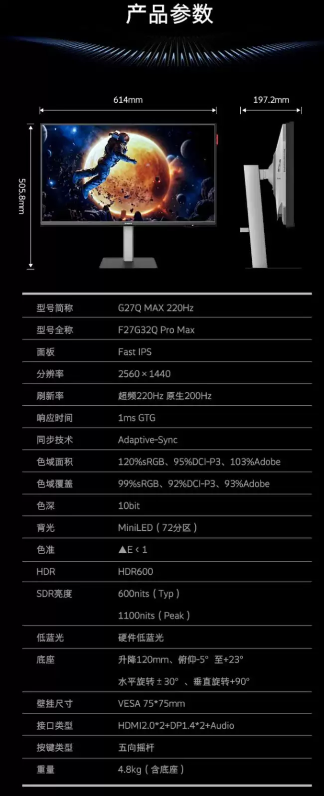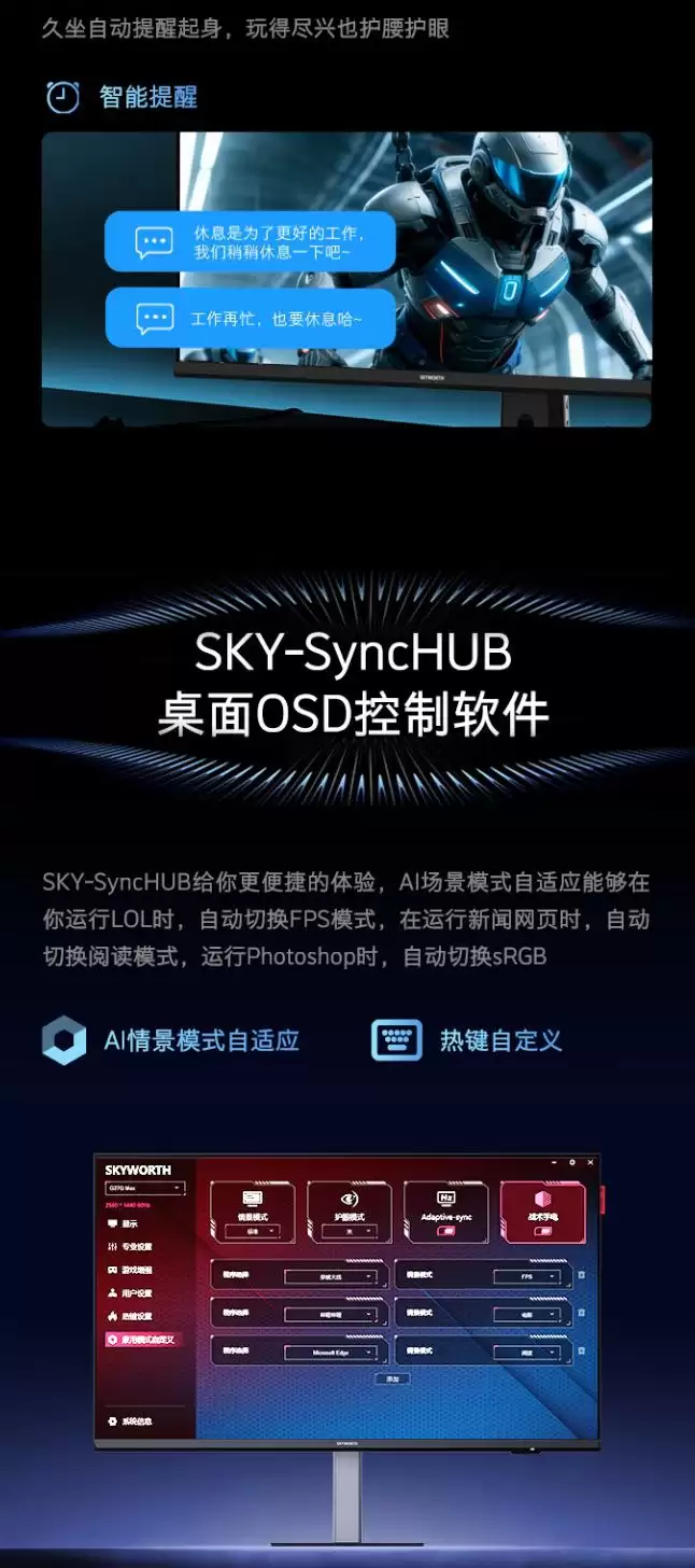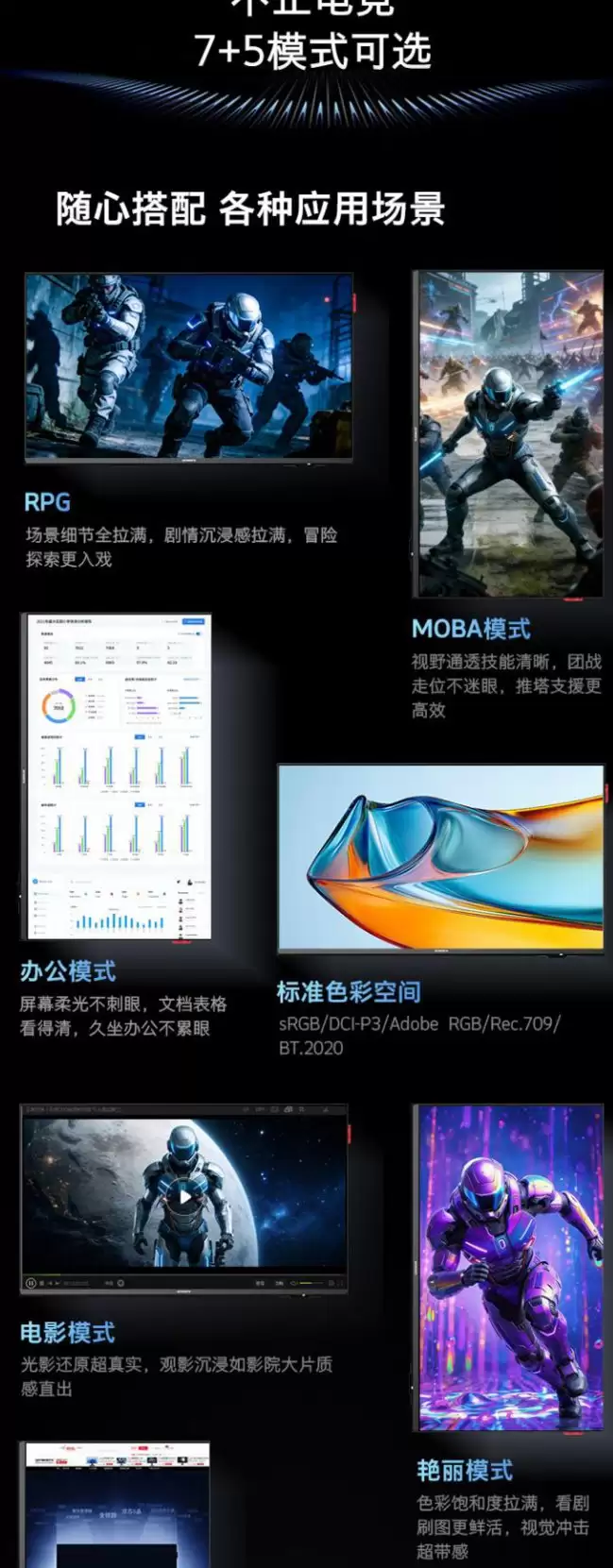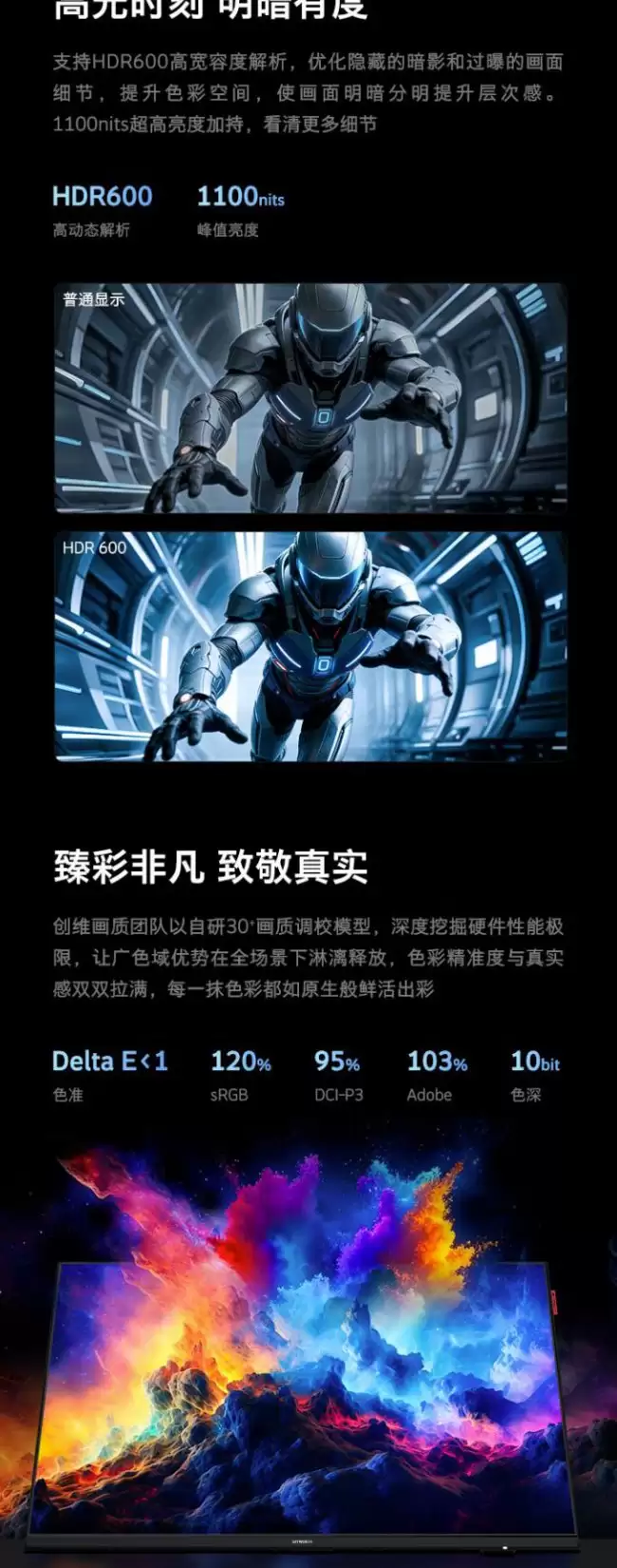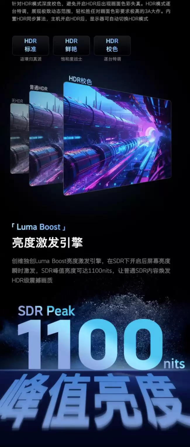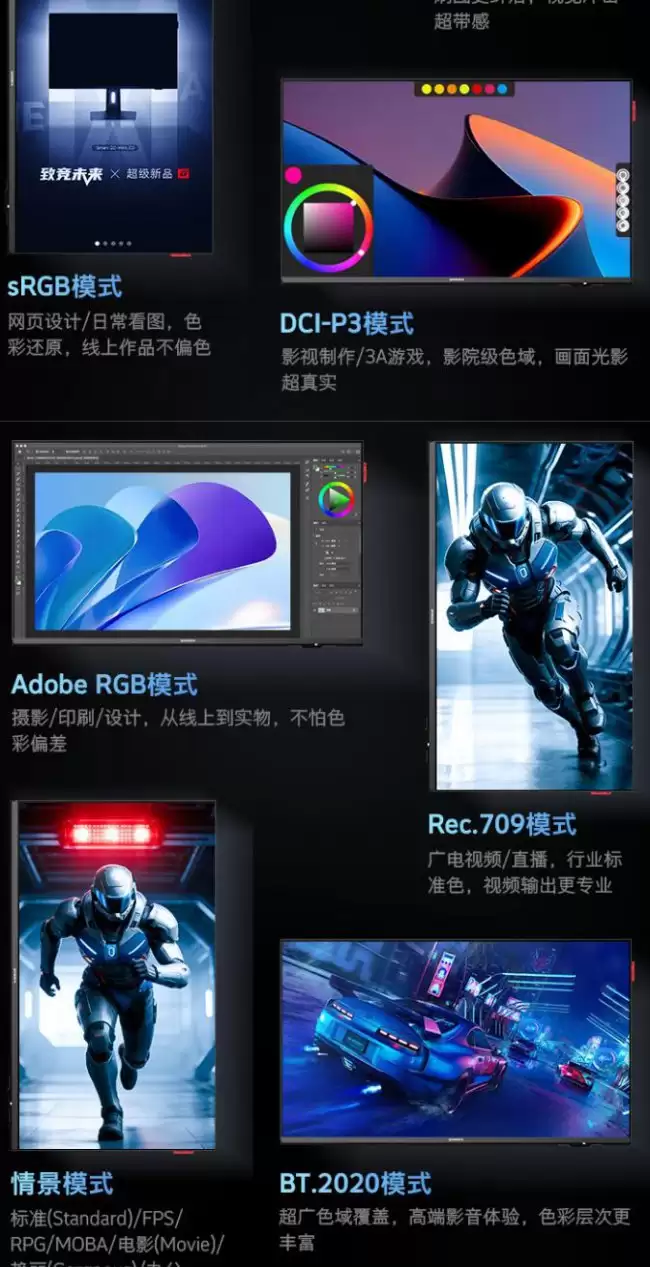 对于内容创作者和追求视觉体验的用户而言,色彩表现是关键。这款显示器支持HDR600标准,能够提供更高的宽容度解析。色域覆盖方面,它达到了120% sRGB、95% DCI-P3以及103% Adobe RGB,并且支持10bit色深,色彩过渡会更加平滑。色彩准确度上,其平均ΔE值小于1,达到了专业级显示器的入门水准。为了方便不同场景使用,它还提供了3种HDR模式,并支持自动切换。