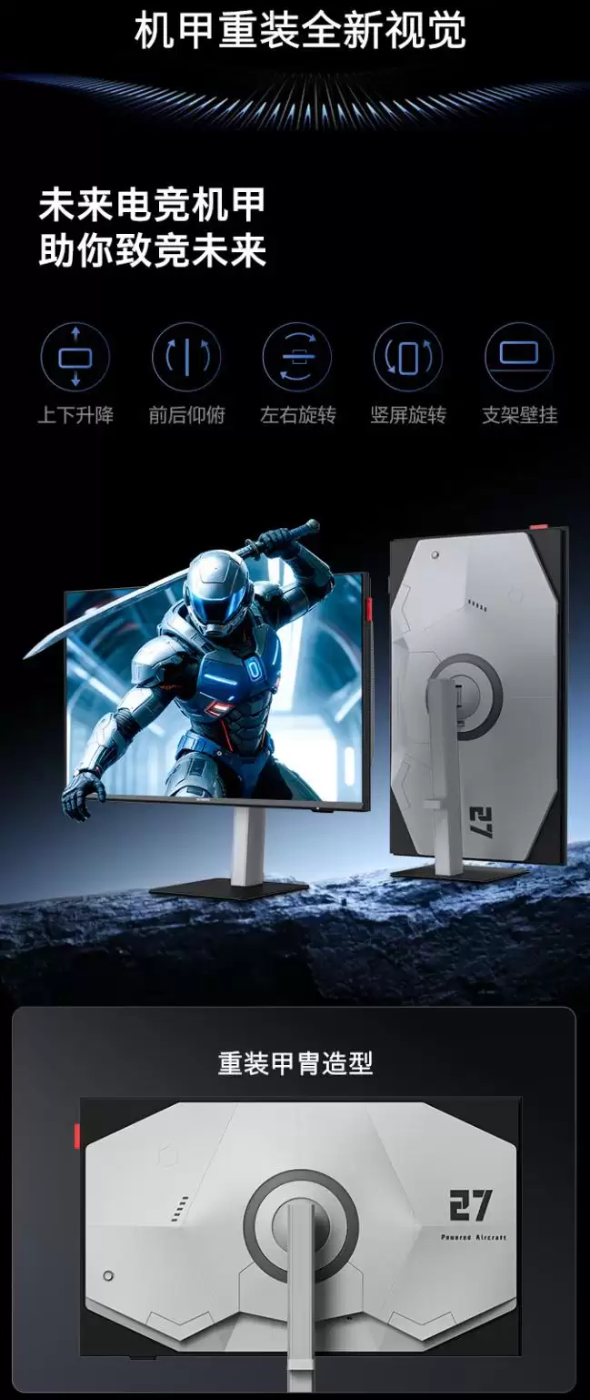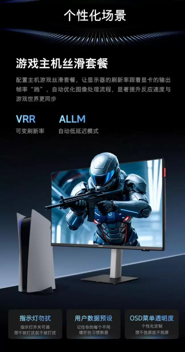 除了核心的画质与速度,这款显示器在功能细节上也做了不少文章。它具备动态OD(Overdrive)特调功能,能智能优化响应速度。针对FPS游戏玩家,它还内置了暗部区域提升、夜视仪、战术手电等实用工具,甚至提供了秒表帧率显示功能,方便硬核玩家进行数据监控。此外,显示器配备了环境光感应模块,可以根据周围光线自动调整屏幕亮度和色温,更护眼也更省电。VRR可变刷新率也是标配。在人体工学方面,自带的支架支持升降、俯仰以及垂直旋转调节,方便用户找到最舒适的观看角度。