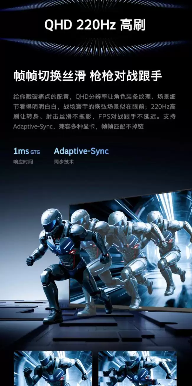 既然定位高刷新率,游戏性能自然也是重点。它的GTG灰阶响应时间可达1ms,能有效减少高速运动画面中的拖影。同时,它支持Adaptive-Sync同步技术(兼容AMD FreeSync和NVIDIA G-Sync Compatible),这对于减少游戏时的画面撕裂和卡顿现象至关重要。