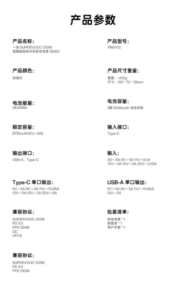 先来看看它的“身材”。整机尺寸控制在105x70x29mm,重量为310克,对于这个功率和容量的产品来说,算是比较紧凑的设计了。配色上提供了颇具速度感的“加速红”。接口配置是核心亮点,一个USB-A和一个USB-C接口均支持最高120W的输出,不过当双口同时工作时,会智能调整为30W加65W的组合输出模式。协议兼容性方面也无需担心,主流的PD、QC以及UFCS等协议都涵盖在内。
