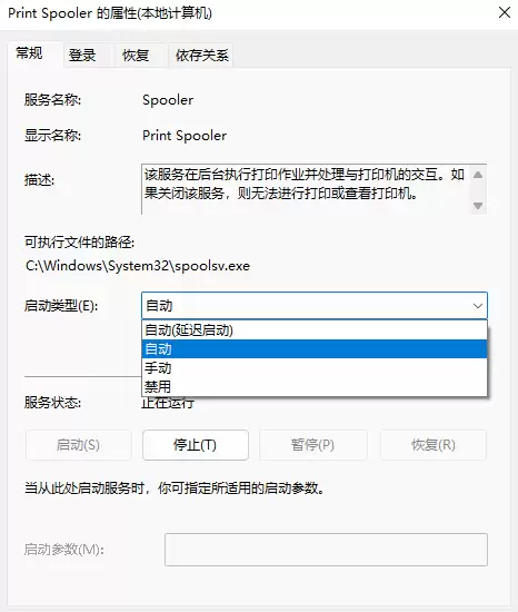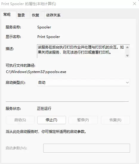 4. 在弹出的Print Spooler属性窗口中,先点击【停止】按钮,等待服务完全停止后,再点击【启动】按钮。