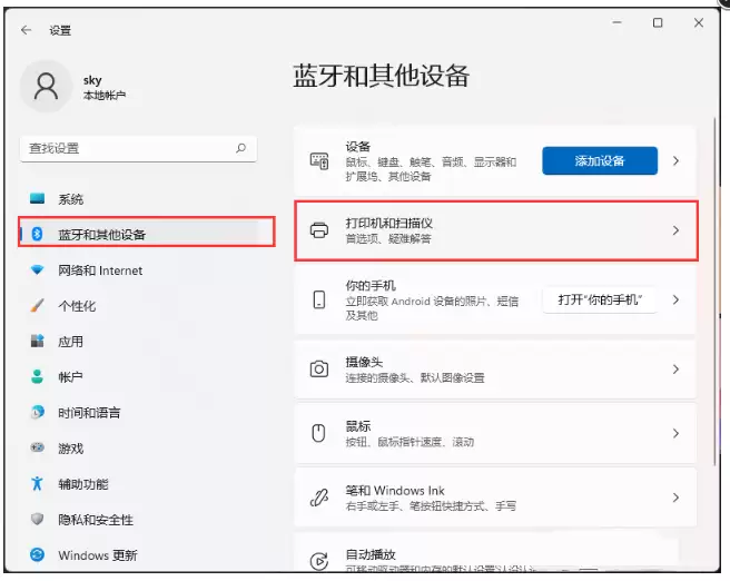 2. 在设置页面,依次进入【蓝牙和其他设备】 -> 【打印机和扫描仪】。
