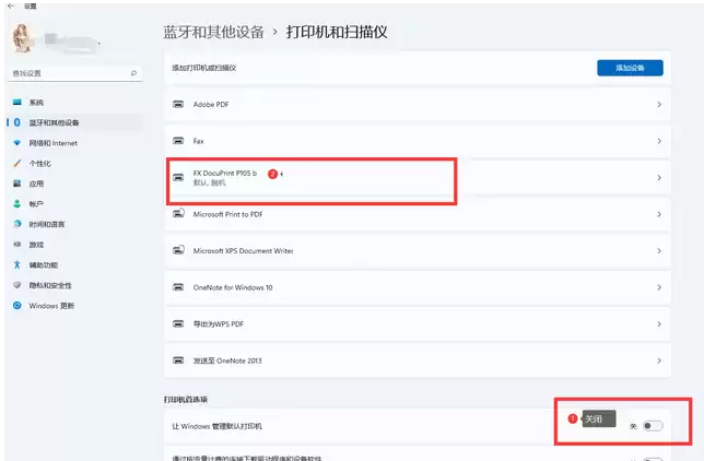 3. 在这里,首先关闭“让Windows默认管理打印机”这个选项(把选择权拿回来),然后在设备列表中点击你真正想要使用的那台打印机。