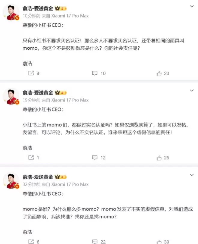 您的位置:首页 >俞浩连发三条微博实名喊话小红书CEO:公开质疑平台实名机制