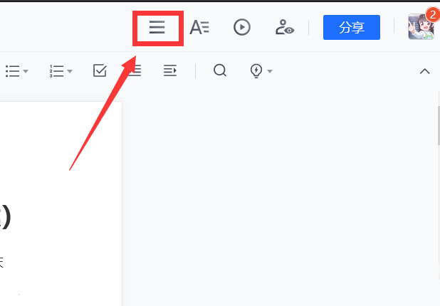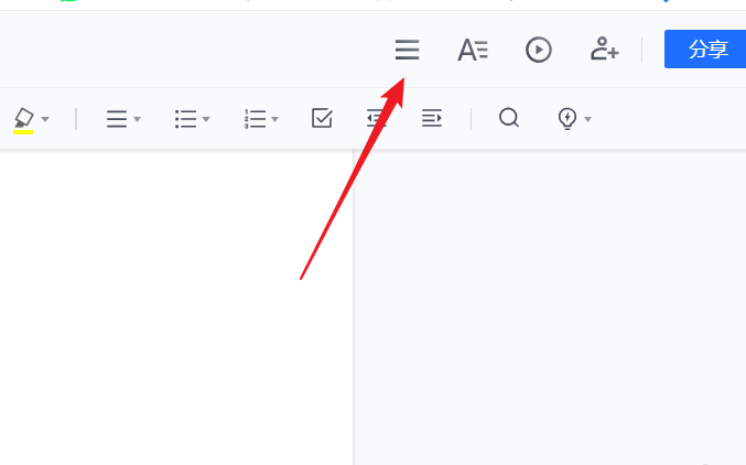 第四步,进入文档编辑界面后,注意看右上角。那里有一个由三条横线组成的【菜单】图标,点击它。
