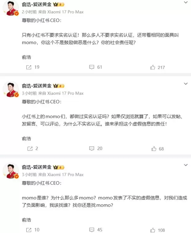 字里行间,是几个直击灵魂的质问:“momo是谁?为什么那么多momo?为什么只有小红书不要求实名认证?那么多人不要求实名认证,还带着相同的面具叫momo,你这个不是鼓励做恶是什么?”