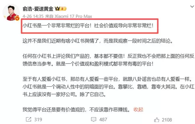 事实上,这场风波早有预兆。就在前几天,俞浩已经公开炮轰,直言“小红书是非常非常烂的平台”,批评其价值观和盈利模式“有毒”,并扬言要连带平台一起起诉造谣的博主。