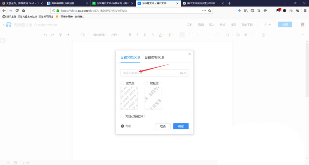 这时,一个专门的设置面板会弹出来。看,关键的地方来了——图中箭头所指的输入框,就是让你大展身手的地方。在这里,你可以尽情输入想要展示的水印文字,比如“公司机密”、“请勿外传”或者你的个人名称。