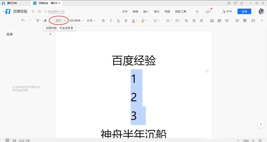 5、文字选中后,目光再回到上方菜单栏。你会发现原本可能是“正文”的按钮,现在需要你点击它。