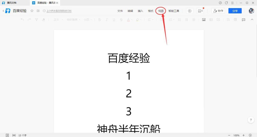 2、文档打开后,注意看上方那一排功能菜单栏。找到并点击“视图”这个按钮。