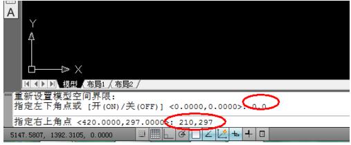 接下来就是设置具体的图形界限范围了。如果你想设置成A4图纸的大小,那么就在提示后输入0,0;210,297。当然,如果是更常用的A3图纸(尺寸为297mm×420mm),那对应的输入就应该是0,0;297,420。