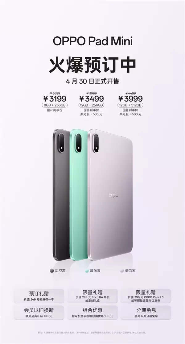 您的位置:首页 >OPPO Pad Mini 4月30日开售:8.8英寸小屏旗舰,国补后3199元起